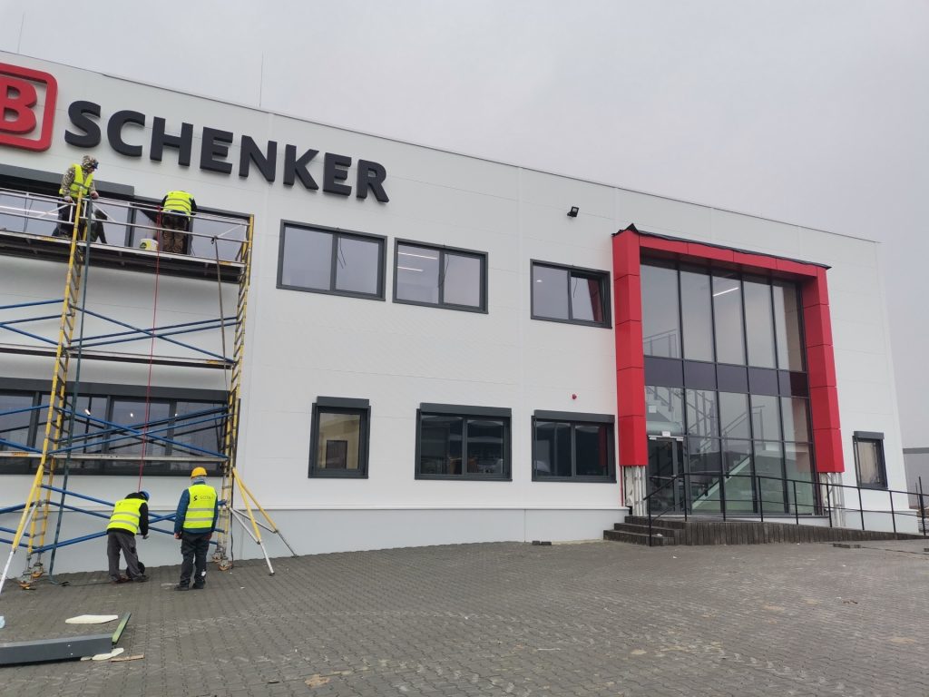Budynek hali magazynowej – wykonano fasady aluminiowej oraz daszki szklane.